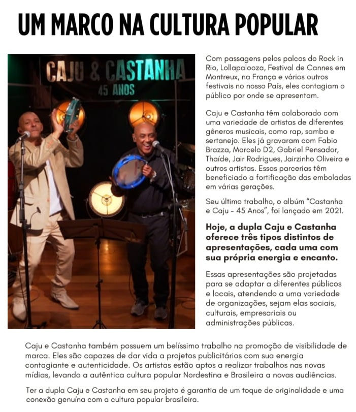 Ter Caju & Castanha em um projeto é garantir autenticidade, impacto cultural e uma conexão genuína com as raízes da música popular brasileira.